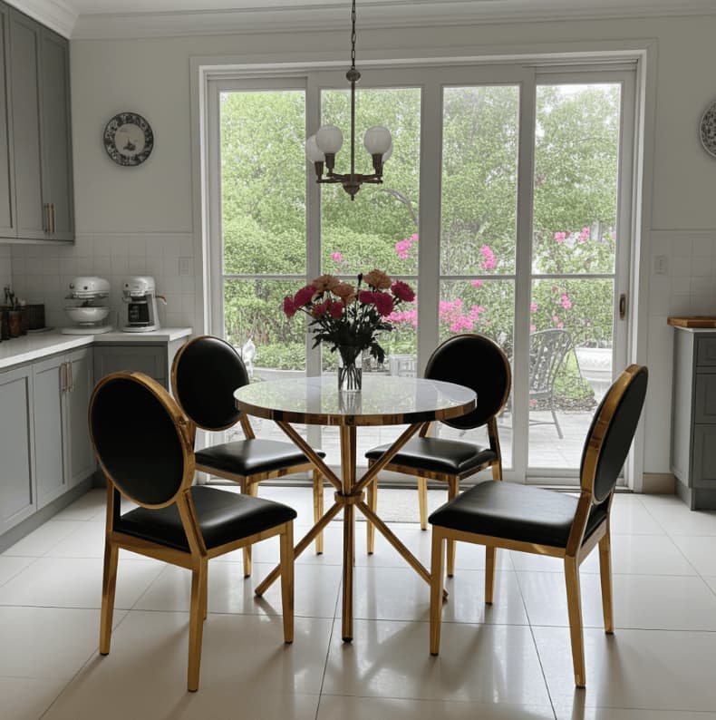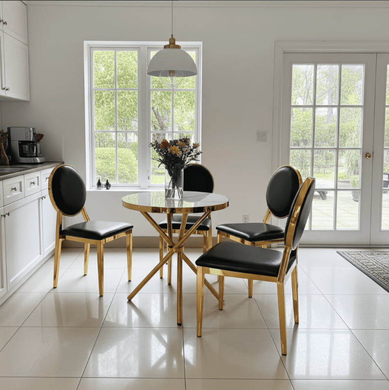 The four accompanying chairs feature the same polished gold-tone stainless steel frame and are upholstered in soft, easy-to-clean black faux leather. The iconic oval backrests provide supportive comfort and complete the glamorous, contemporary aesthetic. This set is designed for those who want to inject bold style and high-end glamour without compromising on functionality.