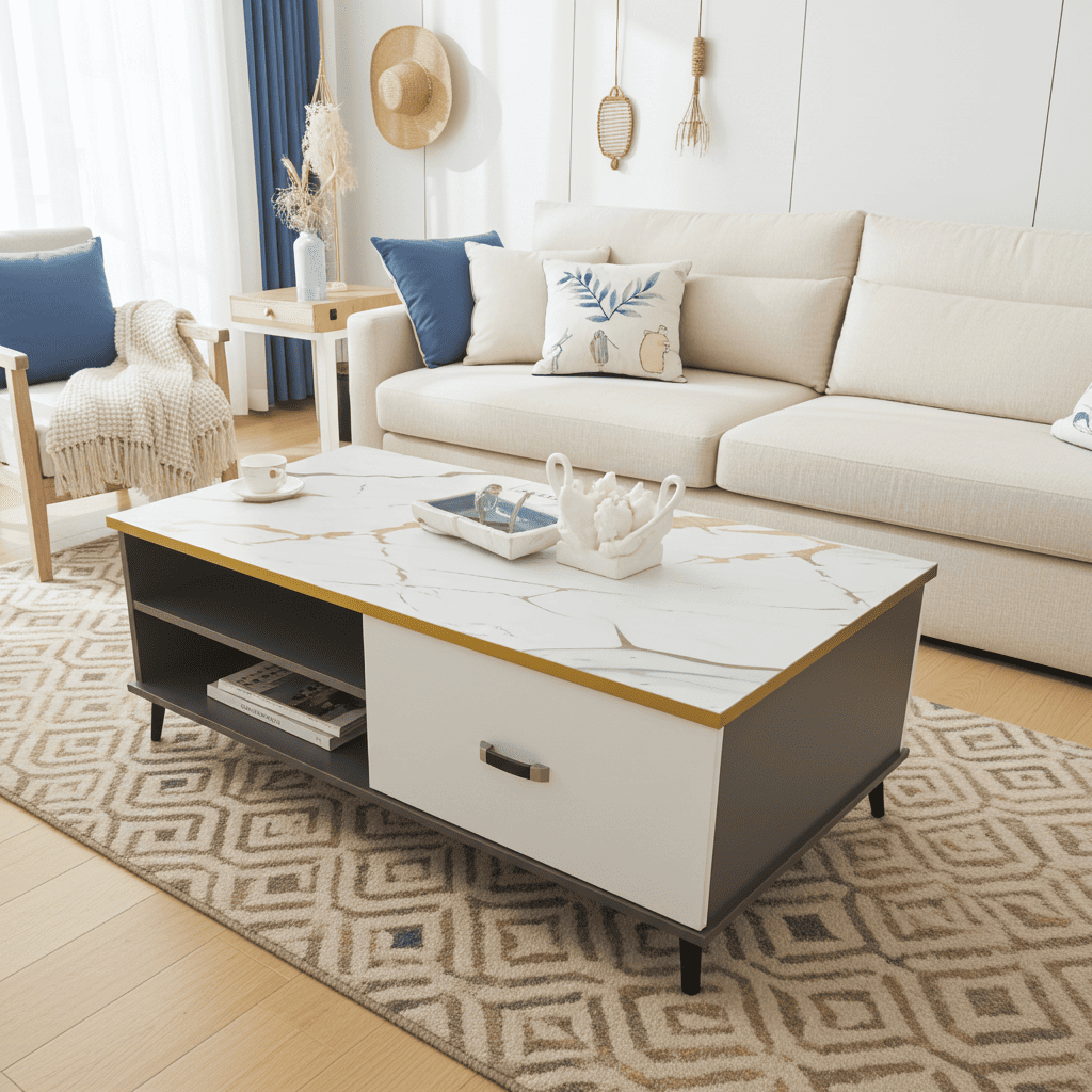 This coffee table is not just about looks—it’s built for smart living. Equipped with two open shelves and two sliding drawers, it helps you maintain a clutter-free living room. Store magazines, remote controls, chargers, or even board games in the drawers, while using the open shelving to display your favorite books or decorative baskets.