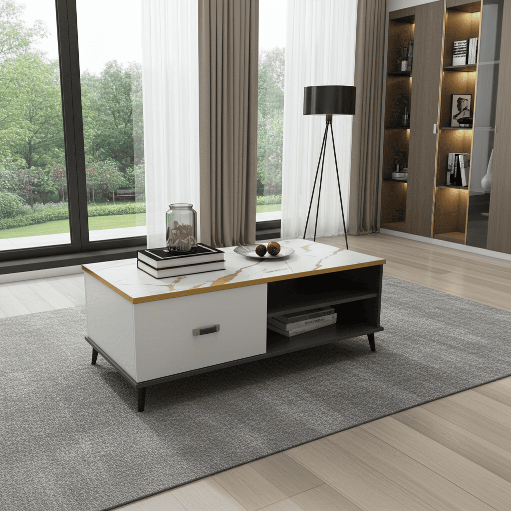 Transform your living space with the timeless beauty and practicality of the 1.2m Marble Finish Coffee Table—a refined centerpiece that combines modern aesthetics with everyday convenience. With its stunning marble-effect top, sleek dual-tone body, and intelligent storage design, this table is more than just furniture—it’s a statement of luxury and function in one.