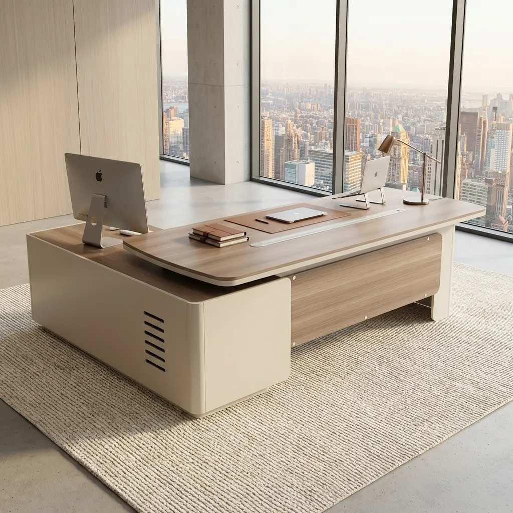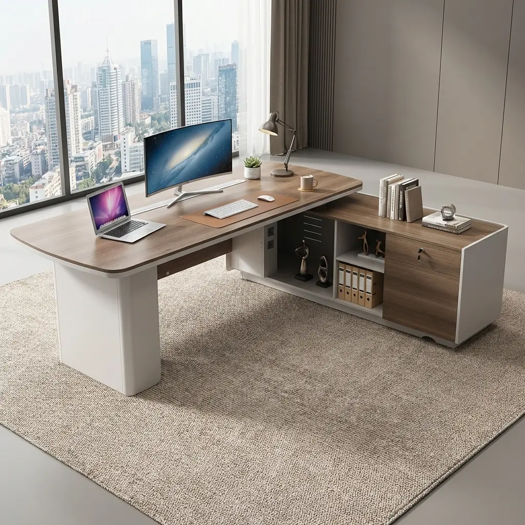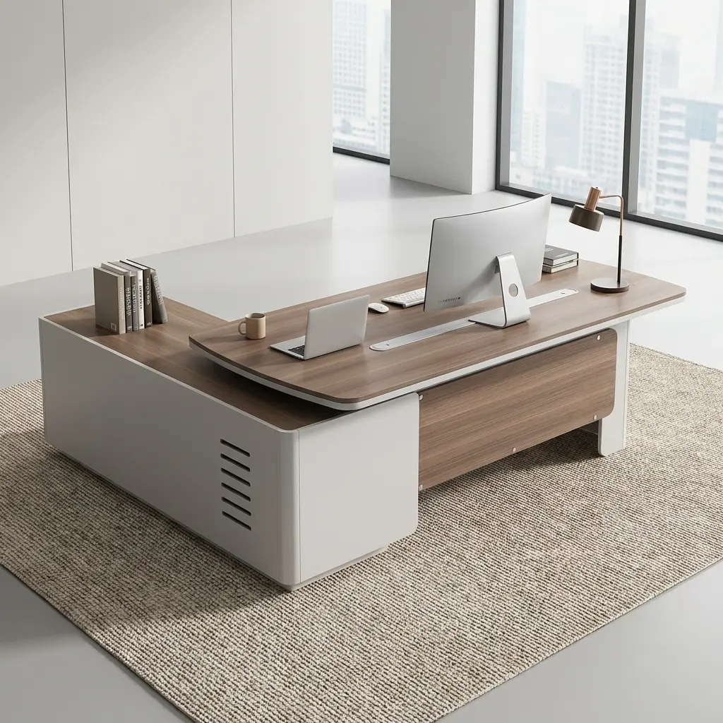 The combination of warm wood tones and smooth white finishes delivers a balanced, contemporary look that fits seamlessly into modern offices. This design ensures your workspace feels professional, inviting, and aligned with high-end corporate standards.
