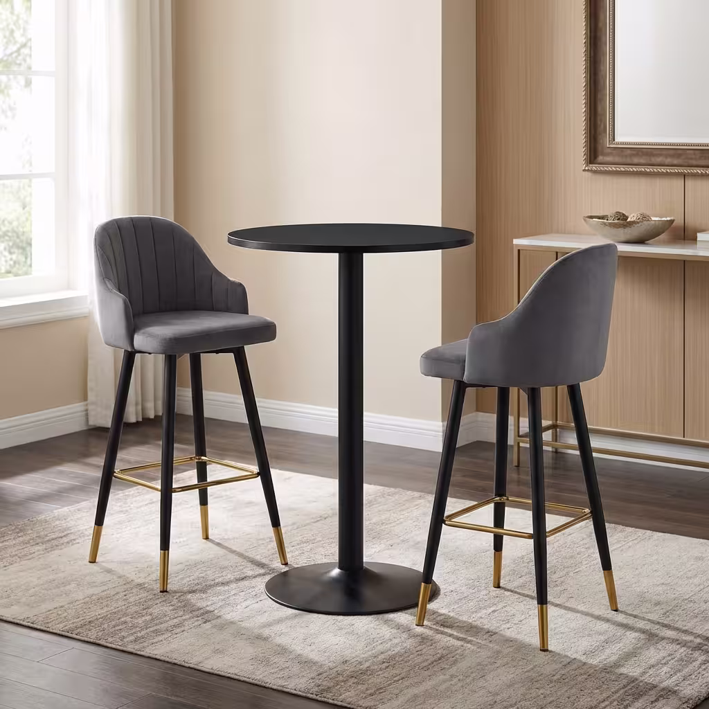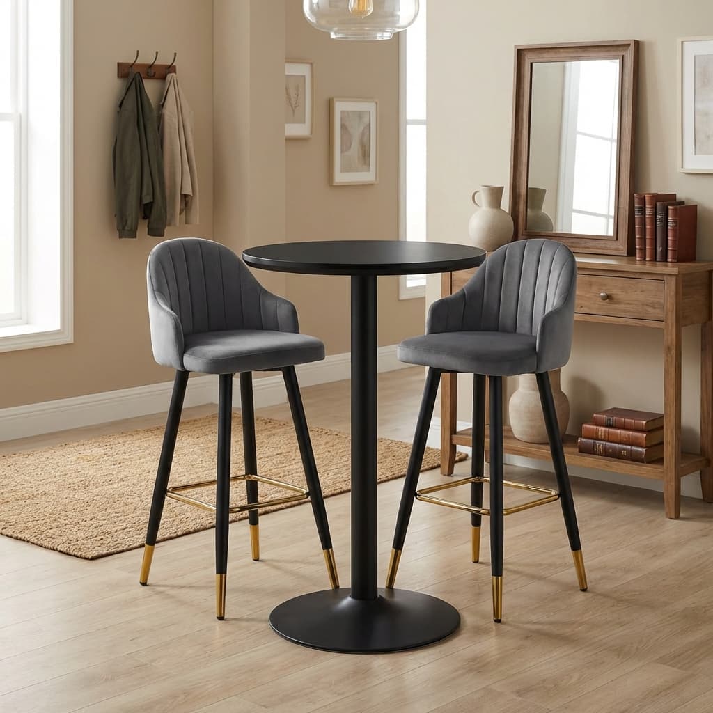 The Chic Bar Stools & Table Set features a minimalist black pedestal table paired with two high-back bar stools upholstered in soft gray fabric. The stools are supported by black legs with gold-tipped feet and integrated footrests, adding a touch of luxury to the clean silhouette. The round table’s compact footprint and matte finish complement the geometric lines of the stools, creating a balanced and visually engaging setup.