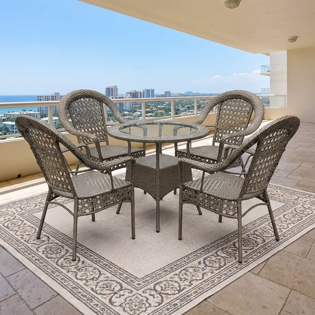 Durability is an essential feature of the Elegant 5-Piece Patio Set. Built with a strong frame and high-quality woven material, it is designed to withstand outdoor conditions while maintaining its appearance over time. This makes it a reliable choice for both residential and commercial use, including homes, apartments, cafés, hotels, and resorts.