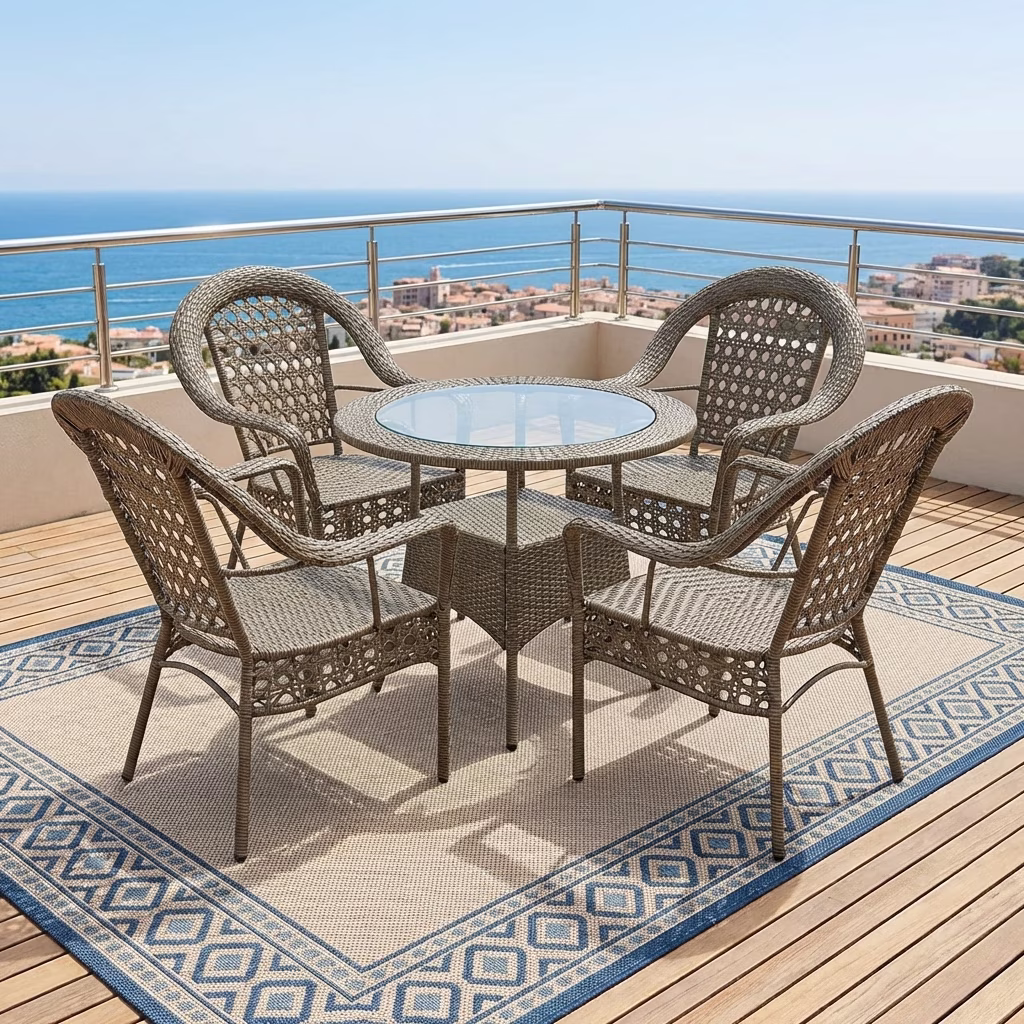 The Elegant 5-Piece Patio Set includes four stylish woven chairs and a matching round glass-top table, offering a complete outdoor seating solution for small gatherings and everyday use. Its thoughtfully arranged design encourages conversation and interaction, making it ideal for family time, coffee breaks, or hosting guests in a cozy outdoor setting.