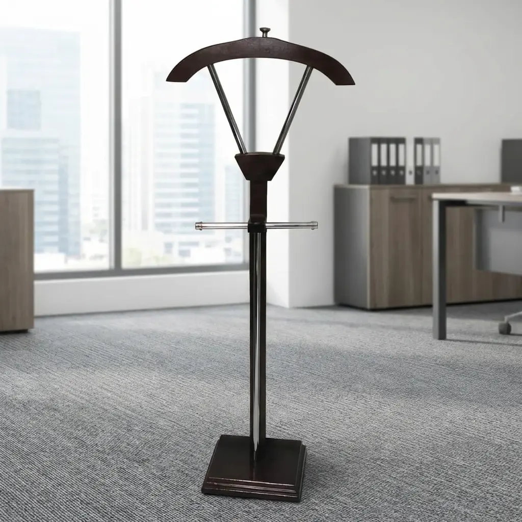 The Executive Valet Suit Stand also includes metal support rods that reinforce the structure while adding a modern touch to the design. The combination of wood and metal creates a balanced appearance that is both stylish and durable.