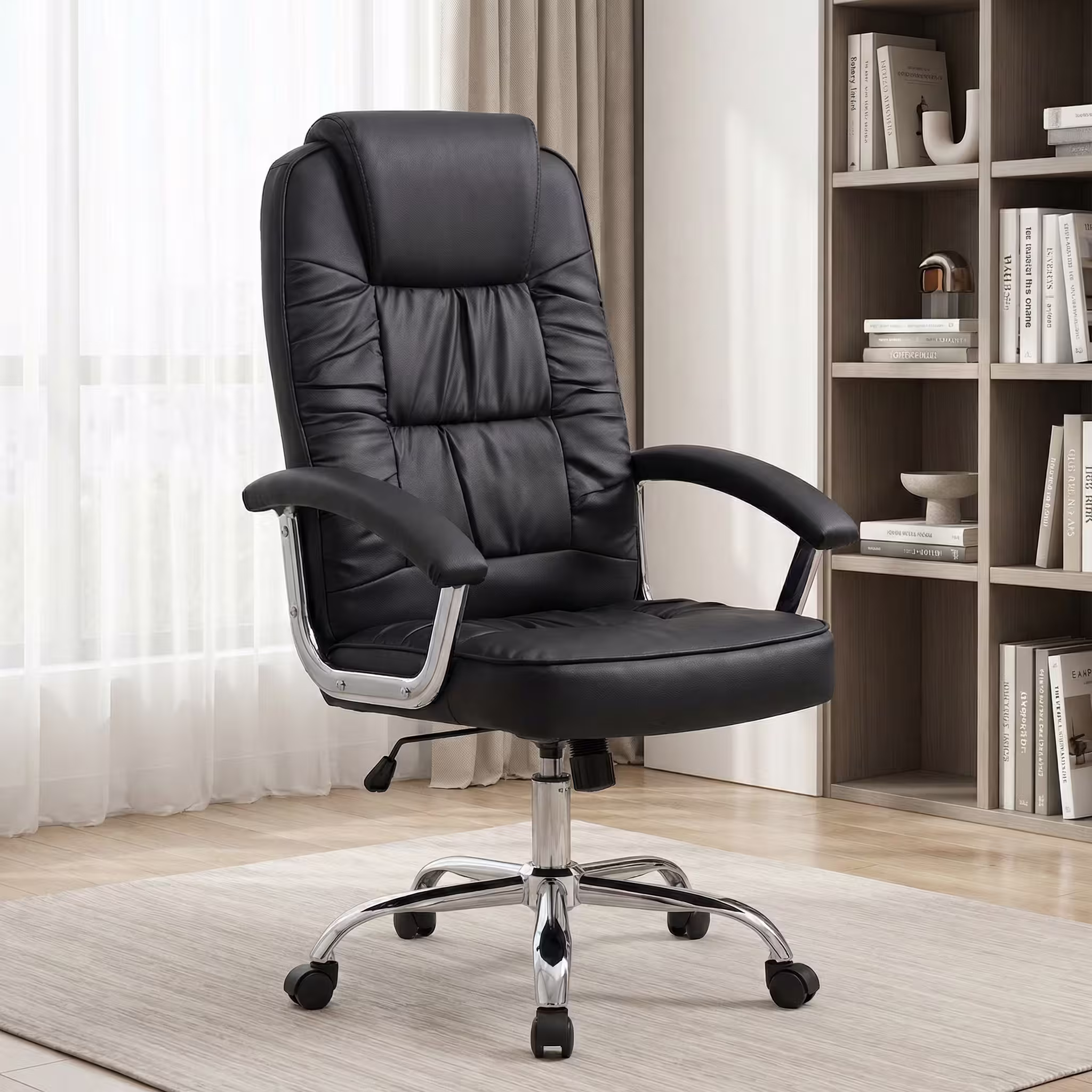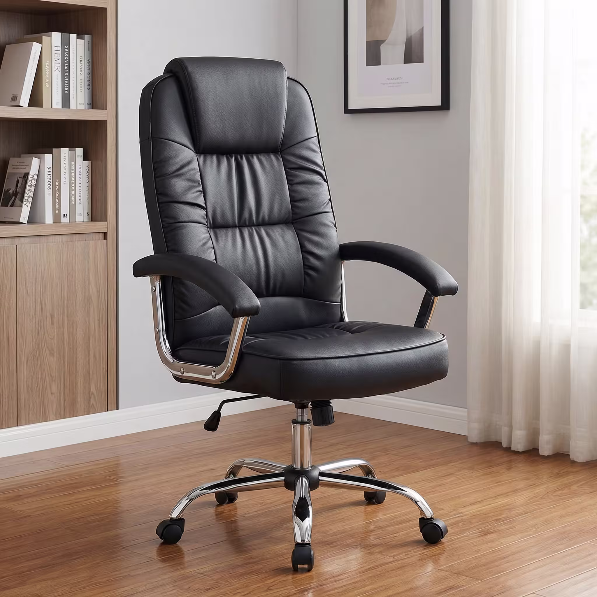 The High Back Leather Office Chair features fixed padded armrests with a sturdy metal support frame. These armrests provide stable arm support, helping to reduce shoulder and arm tension during extended use. The chrome-finished arm structure adds a modern, premium touch while enhancing the overall strength and durability of the chair.