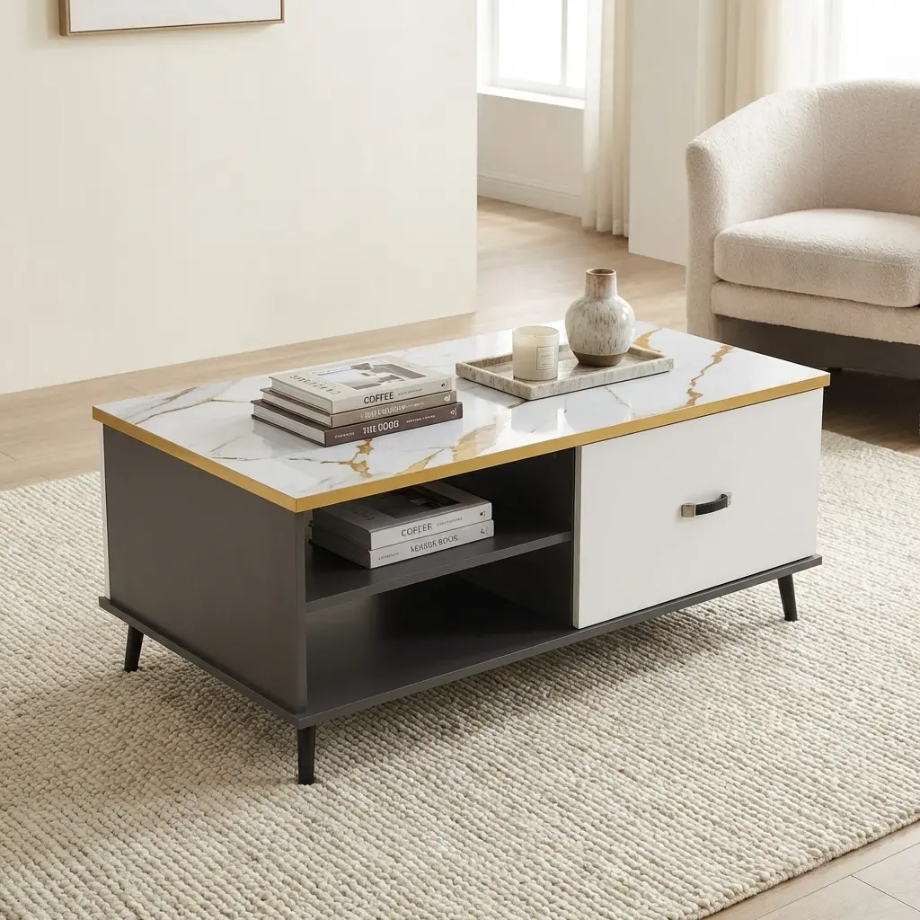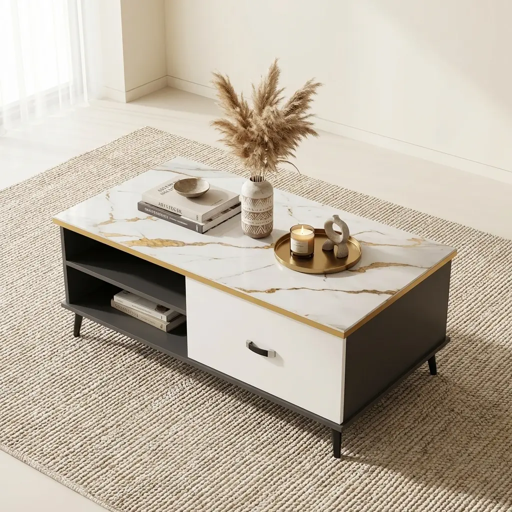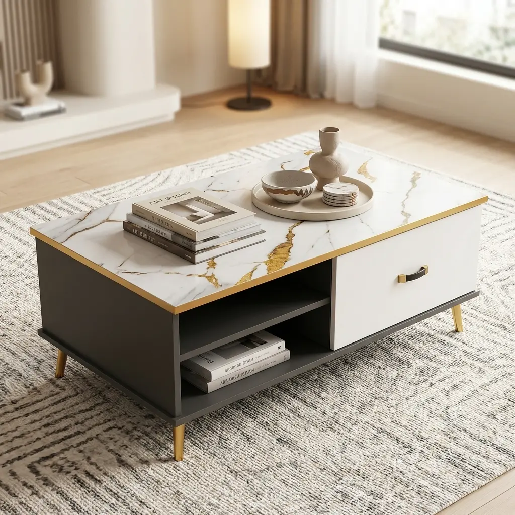 A stylish Luxury Gold-Trim Center Table with a marble-look top, 2 drawers, and 4 shelves—perfect for modern living rooms and office lounges.