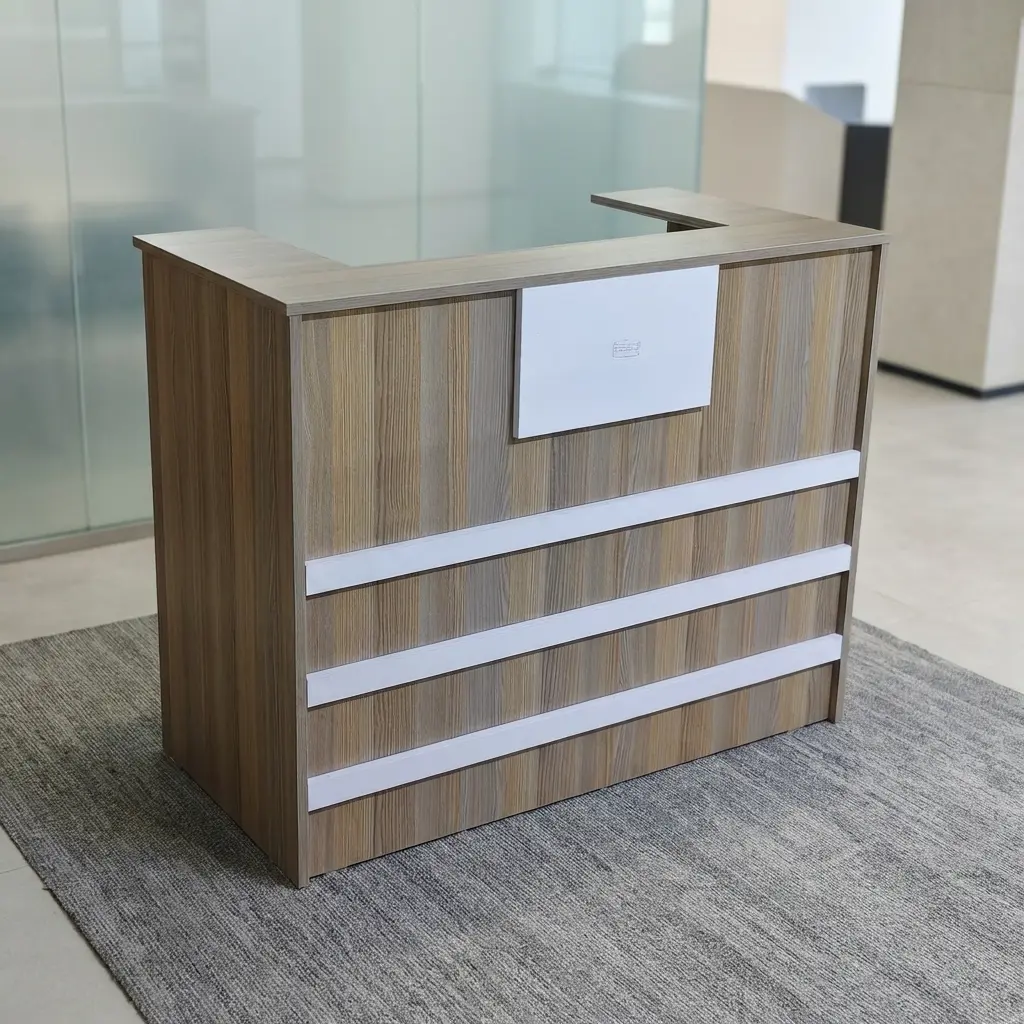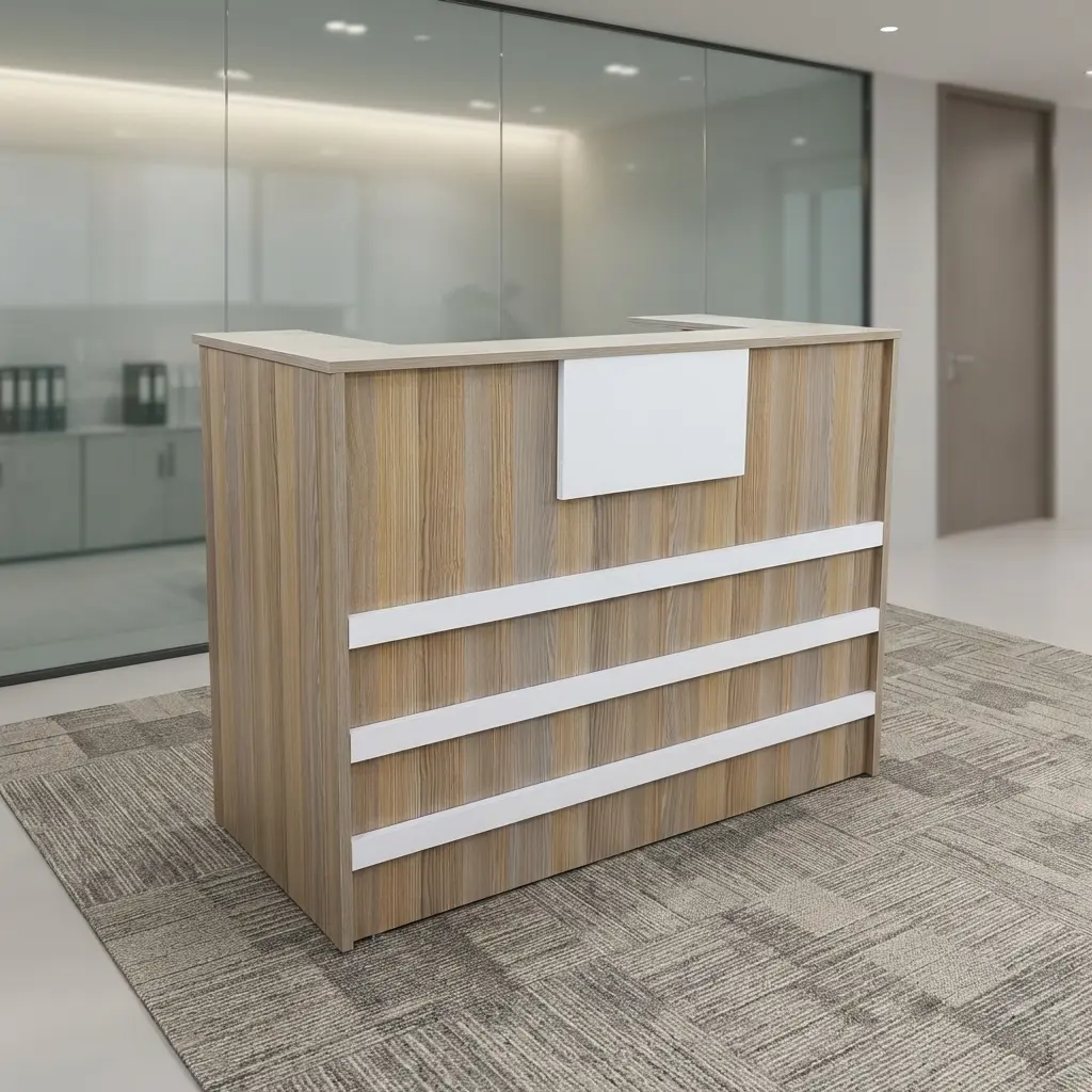 The modern wood and white finish ensures that the desk maintains an attractive appearance while offering a comfortable workspace for reception staff. Its compact dimensions make it particularly suitable for offices aiming for a stylish reception area without occupying excessive space.