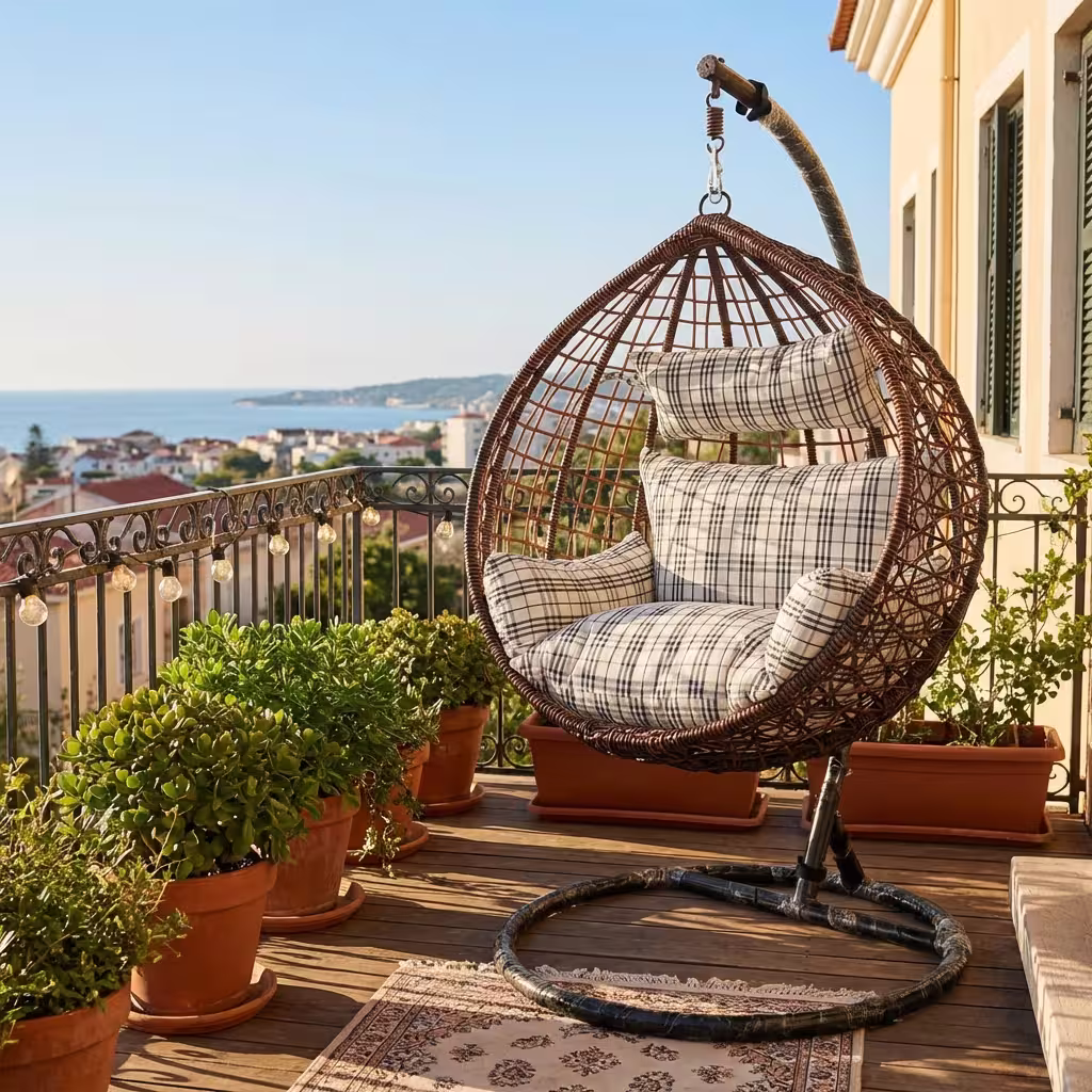 The Serene Rattan Hanging Swing is defined by its deep, cocoon-like silhouette that provides a sense of security and comfort. The chair is hand-woven using premium synthetic rattan, featuring an intricate open-weave pattern that allows for cooling airflow while maintaining incredible structural strength. The dark cocoa finish of the rattan offers a timeless, organic look that complements any architectural style. Supported by a heavy-duty, powder-coated steel C-stand and a high-tension spring, the swing provides a smooth, silent swaying motion that helps melt away the stress of the day.