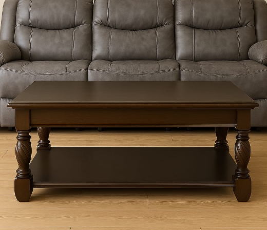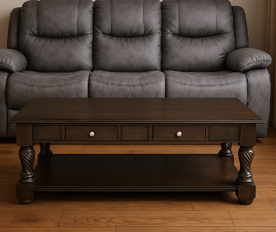Add timeless charm and smart storage to your living room with the Solid Wood Coffee Table with Storage. Crafted from 100% solid wood with a rich dark finish, it features elegant turned legs, three front drawers for discreet organization, and a full-length bottom shelf for open storage. Durable, stylish, and functional—this coffee table is the perfect centerpiece for any classic or contemporary home.
