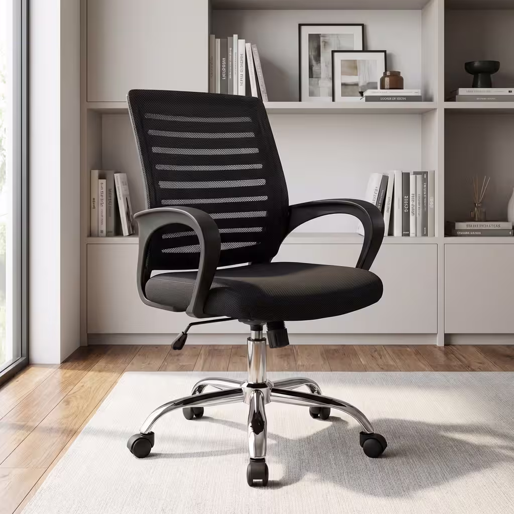 Pair this chair with a light wood desk or minimalist workstation for contrast. Add a desk lamp, framed photo, or branded notebook to personalize the space. Position near natural light to highlight the chrome accents and mesh texture.
