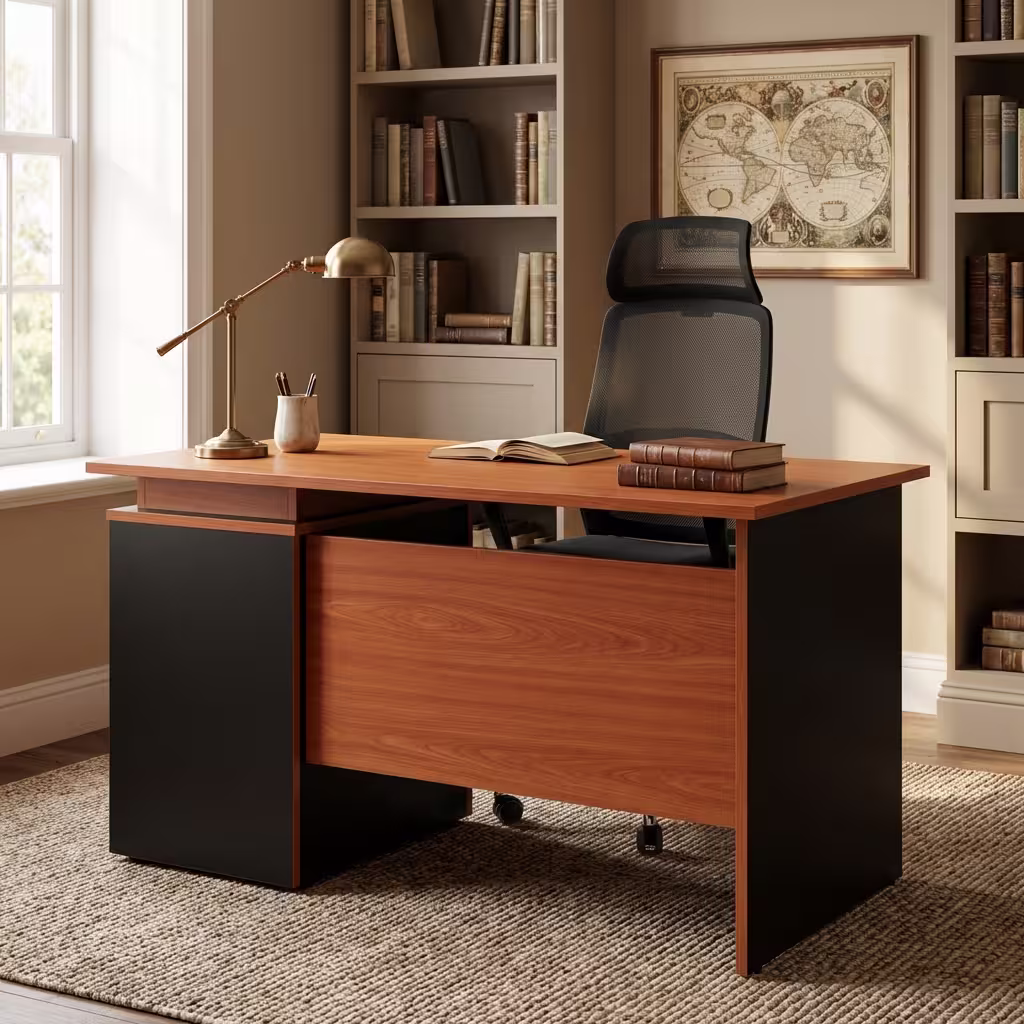 Pair this desk with a black ergonomic chair for visual harmony and posture support. Add a desk lamp, framed photo, or branded notebook to personalize the space. Position near windows to enhance natural light and highlight the woodgrain texture.