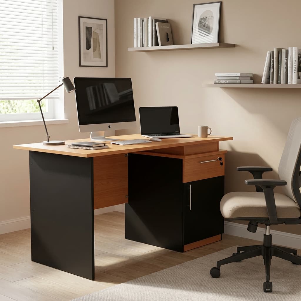 The surface comfortably accommodates a desktop monitor, laptop, desk lamp, coffee mug, and notebooks—ideal for multitasking professionals. A built-in drawer and cabinet provide secure storage for stationery, files, and personal items, keeping the workspace clutter-free and efficient.